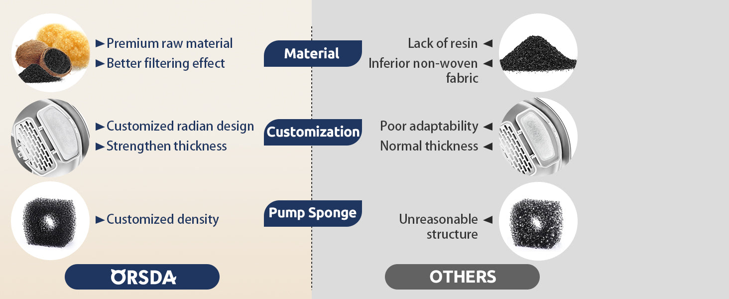 đșăWhy You Should Choose ORSDAă ORSDA devoted to providing premium filters which through strict quality control from material source to production, which obtained SGS and Rohs Safety Certification. The activated carbon, resin and cotton- Four-layer filtration can effectively filter out impurities, eliminate odors, combination with concave pattern,black pump sponges strengthen filter effect, keeps the water fresh and clean.